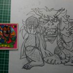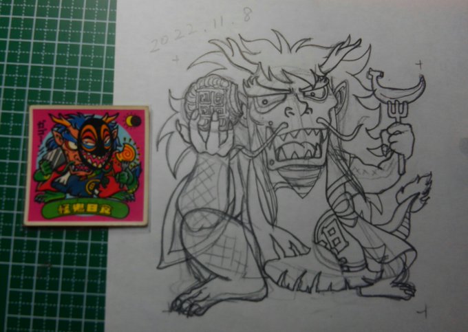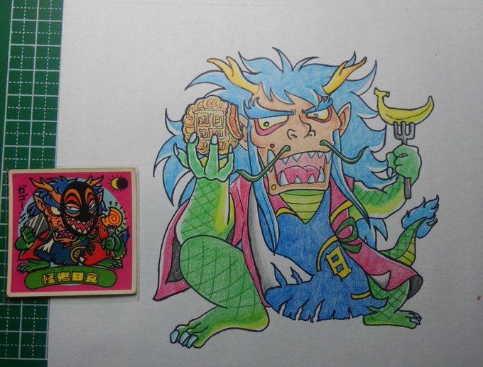 本日は皆既月食でしたね🌑 皆様の所はみえましたか? …何かそれっぽい事、したくなって。 怪鬼月食おじさん、とか妄想落書き。 とりあえず月っぽい「月餅」と「バナナ」を食べてもらいました。 #ビックリマン #落書き #どうしてこうなった
