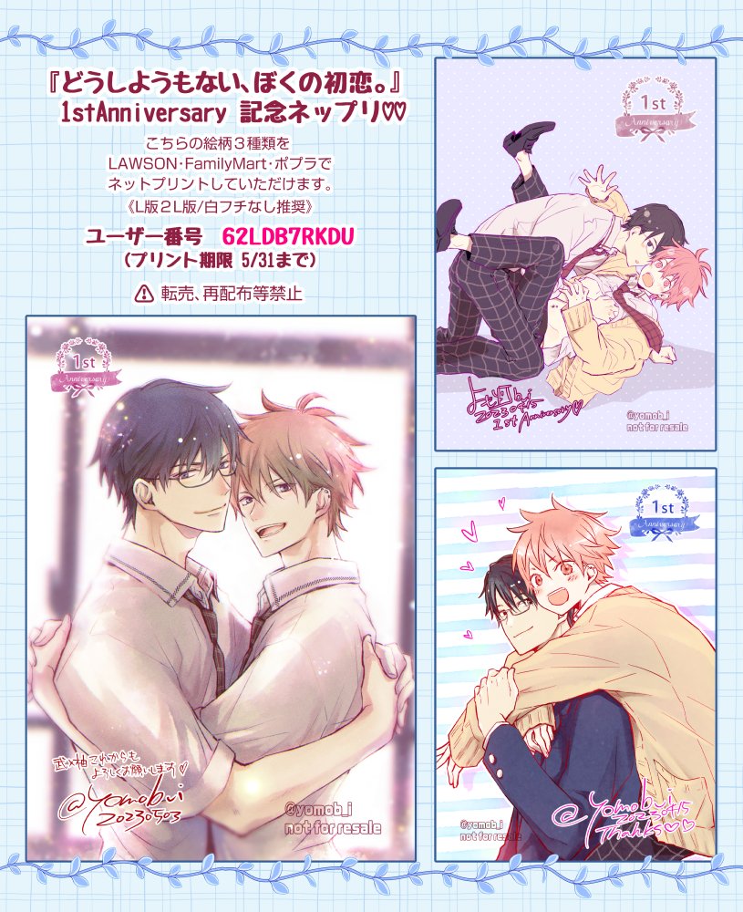 ㊗️デビュー単行本『どうしようもない、ぼくの初恋。』発売から一周年となりました。🎙️ボイコミにしていただいたり、🎖️BLアワードでランクインさせて戴いたりとても頑張ってくれた作品です✨ 記念にネップリ登録しましたのでぜひ飾ってください!💌(1/2) #どうぼく #商業BL twitter.com/i/web/status/1…