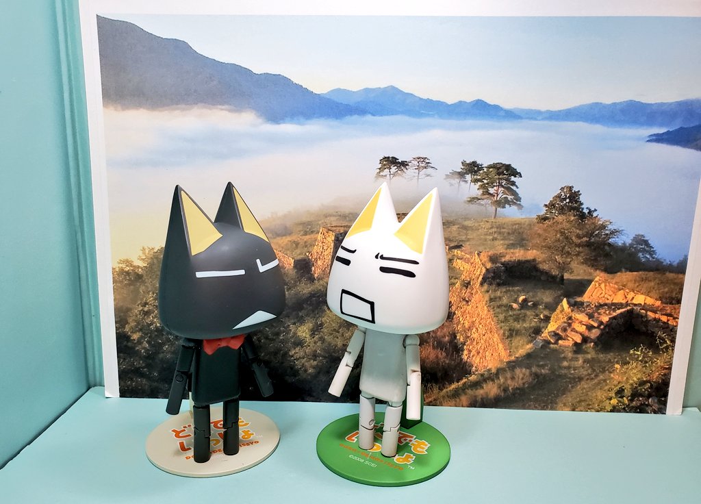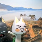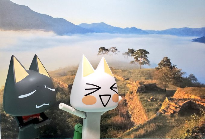 「ここが日本のマチュピチュ、竹田城跡みャ!」 「わーいわーい、と〜ってもキレイな見晴らしなのニャ!」 「……って、やっぱり書き割りじゃふんいき出ないのニャ」 「やっぱダメかぁ、せっかく用意したのにみャ」 #深夜のクロネコネタ真剣60分一本勝負 #どこでもいっしょ #どこいつ