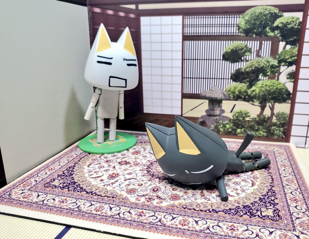 「……おふぅ。ペルシャ絨毯気持ちいいのみャ。このまま二度と起き上がりたくないみャ〜」 「いつものことだけど、すっかりダメネコになってるのニャ」 #深夜のクロネコネタ真剣60分一本勝負 #どこでもいっしょ #どこいつ