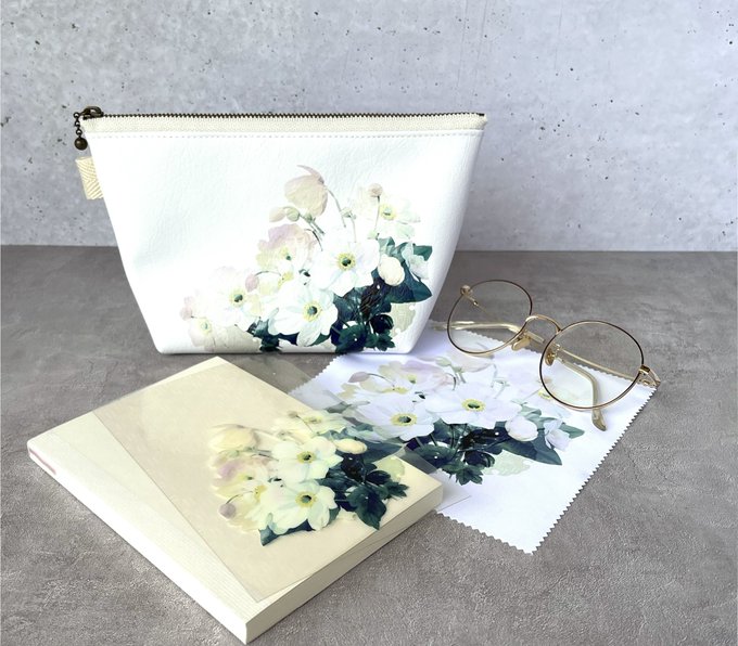 【Creema限定 秋明菊3点セット(三角ポーチ・メガネ拭き・透明しおり)】 ▶︎creema.jp/item/14490696/… アネモネの仲間のお花、秋明菊をモチーフにしたアイテム3点セット、Creemaさん限定で販売中! ギフトにもおすすめのお得なセットです* #どこにもない作品あります #絵 #イラスト #花