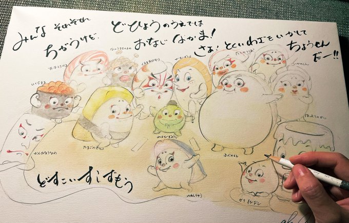 5月に発売予定の「どすこいすしずもう」以前お見せした下絵(部分) に色が入り命が吹き込まれたよう…わいわいがやがやと力士達のおしゃべりが聞こえてきましたよっ👀 みんな何を話しるんでしょうね〜✨ #どすこいすしずもう #絵本 #イラスト