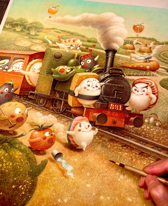 5月刊行予定の「#どすこいすしずもう」野菜畑編〜、ジリジリと〆切が近づいております…💦表紙の仕上げに入っておりますが、おおとろやまのネタの形がちょっといびつですね、、直さなば💦 さぁ、どんな装丁になりますでしょうか〜 楽しみです✨ #絵本 #イラスト