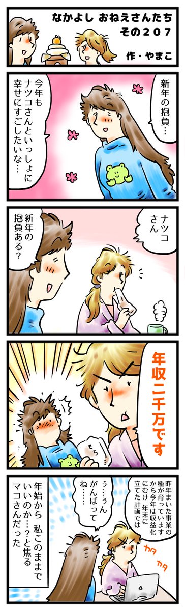 なかよし おねえさんたち その206 来年も、どうか変わらず、このままで。 #なかよしおねえさんたち #創作百合 #漫画が読めるハッシュタグ 今年最後の更新です。応援ありがとうございました。 良い年をお迎えくださいませ。