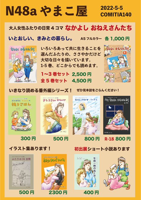 5/5 #COMITIA140 に参加します。 大人女性ふたりの日常4コマまんが #なかよしおねえさんたち 関連本を持っていきます。 新刊はありませんが、会場限定ペーパーやまとめ買い割引をご用意しています。 また、ショート小説「午前一時のぬくみ」はコミティア初出展となります。 おまちしています!