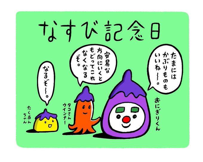 好きな茄子料理を発表します🌟なすとひき肉のカレー。麻婆なす。なすとチーズのミートグラタン。なすの揚げびたし。なす味噌。何だか一杯やりたくなってきました…🍙🍶✨ #漫画が読めるハッシュタグ #1コマ #絵 #なすび記念日 #おにぎり #みんなで楽しむTwitter展覧会