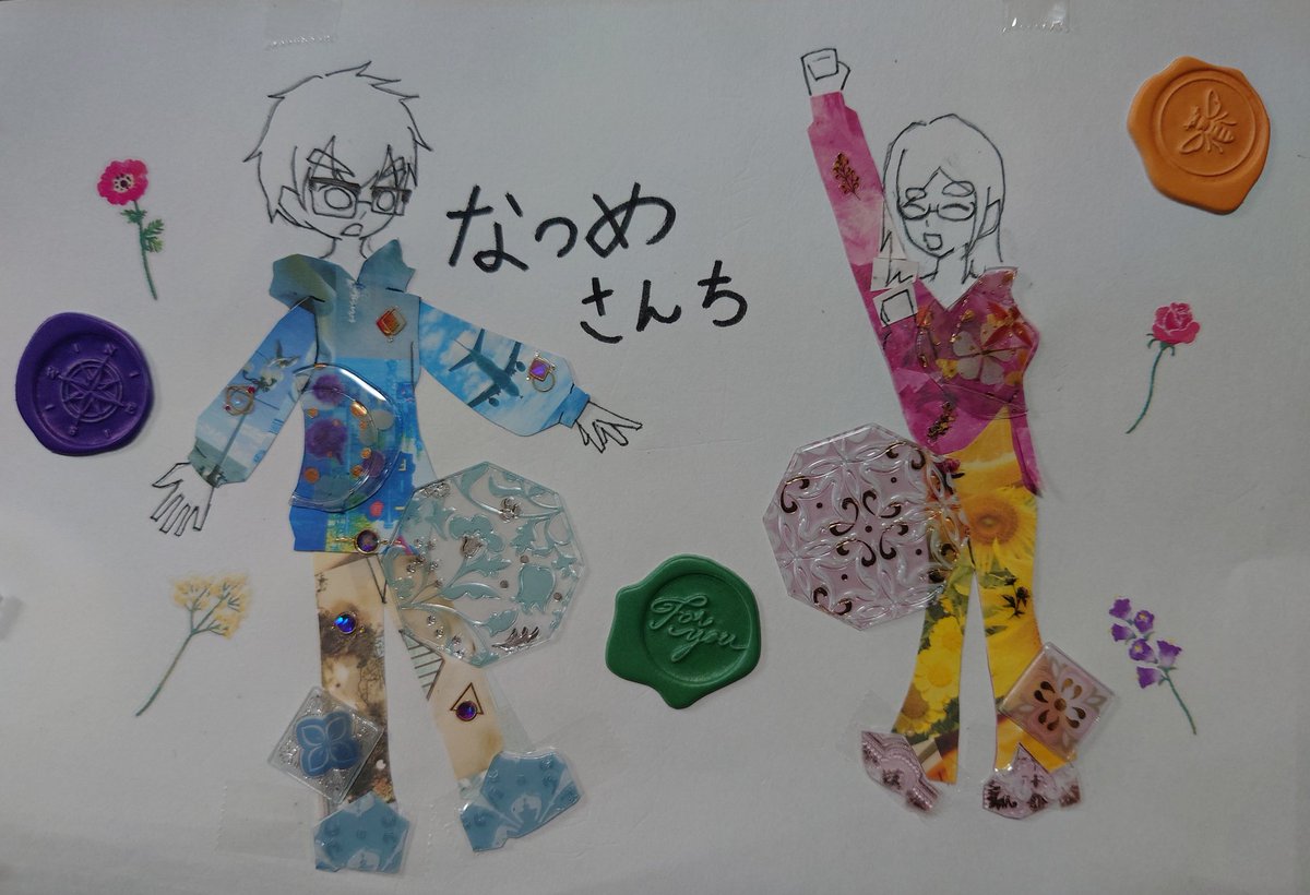 #なつめさんちの美術室 #なつめさんち100万人 #なつめさんち なつめさんちのげんさんさやさん! 100万人突破おめでとうございます。 今さっき考えて作った作品で、折り紙やシールシーリング、ネイルシールなどのシール類で描いたなつめさんちのお二人です いつか、お二人にやって欲しいです
