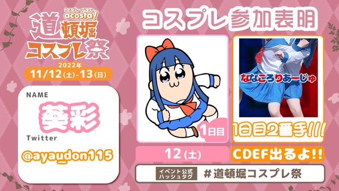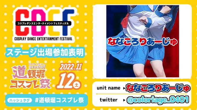 参加表明すっかり忘れてた‼️明日久しぶりのななころりあーじゅステージです‼️2番手で踊ります‼️💃🏻私ピピ美‼️ナナがポプ子‼️ちょっと遠いけど時間ある方是非ともなんばハッチまで見に来てね〜‼️✌️ #道頓堀コスプレ祭 #ななころりあーじゅ #CDEF twitter.com/coloriage_04…