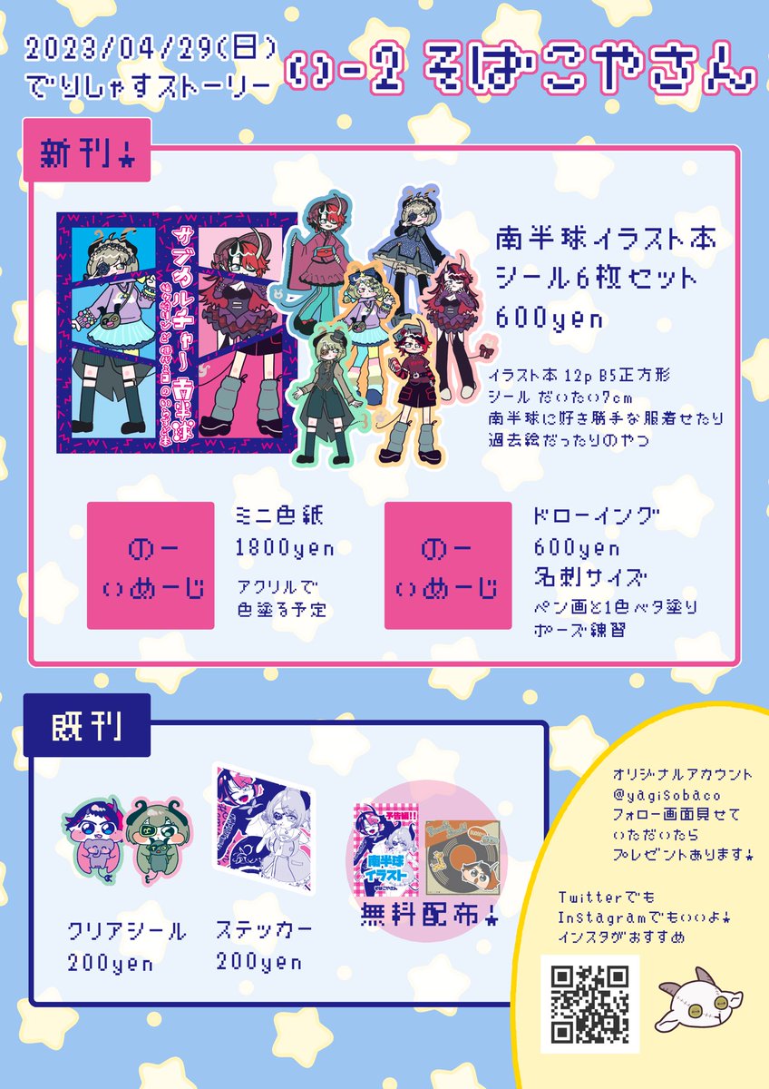 #ななしいんくオンリー お品書き更新しました! 🌎いー2 そばこやさん!真ん中の方 🌎本とシール6枚ぜ〜んぶセット! 🌎悪魔の600円っておぼえてね! 🌎オリ垢 @yagisobaco フォローでプレゼントあります!(インスタがおすすめ) ⚠️スケブは行いません ⚠️サークルスペースの撮影はご遠慮ください