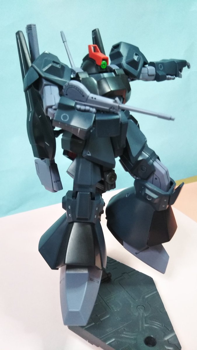 #今月作ったプラモ晒そうぜ 今月完成できたのは、黒いHGUCリックディアス(プレバン)のみ。旧キット箱絵の微妙なポーズを真似てみたが、この右腕は曲げ方逆でしょ。 #ガンプラ #なんちゃってボックスアート