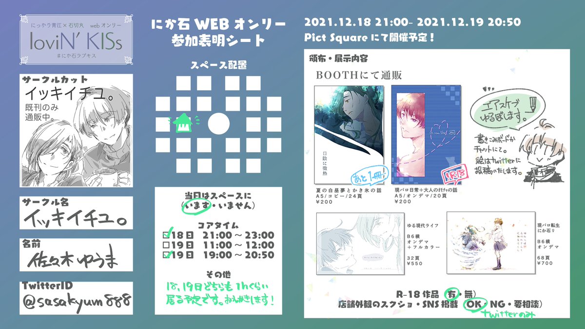 参加表明シートアップします スペース№い3『ふわふわしいところ』当日はエアスケブお題募集(イベスペース内リンク)とネップリ情報です。 よろしくお願いいたします。 #にか石ラブキス 【イベント】にか石webオンリー『loviN' KISs』pictsquare.net/9rlxbpsg8xxcea…