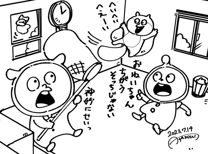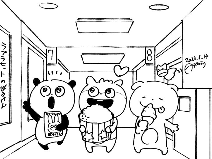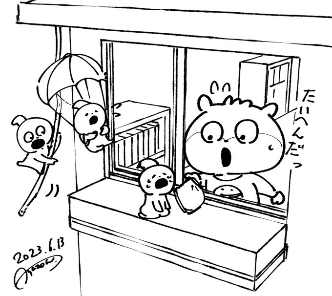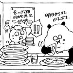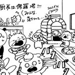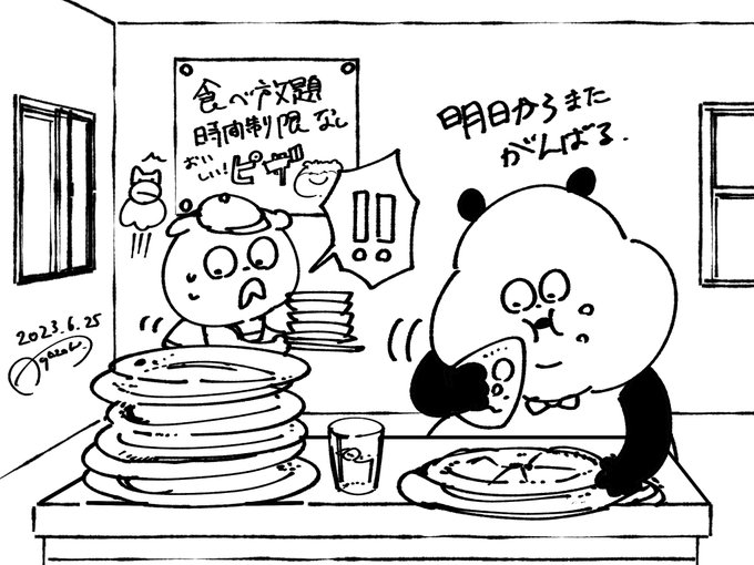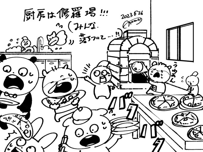 ぶうちゃんが食べてる間の厨房の様子。ピザを素手で持ったり空の皿持っていこうとしたりと、全員テンパってます。 間違えて🐼ちゃん描いてしまった🤣別人ということにして…😇#にしむらゆうじファンアート