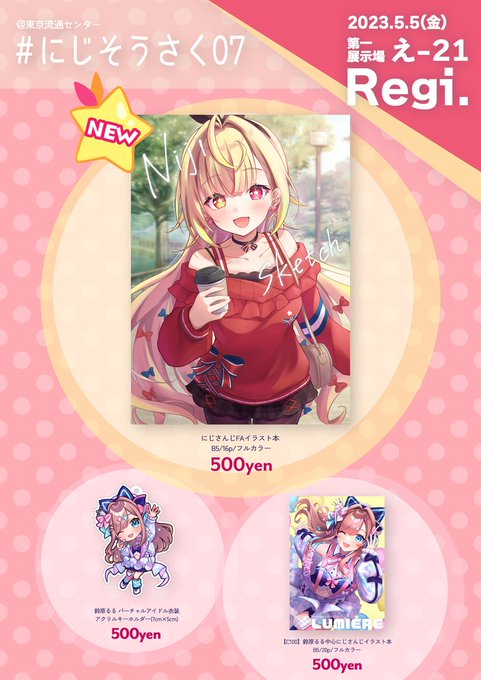【#にじそうさく07お品書き 】 5/5(Fri.)@東京流通センター 新刊「Niji Sketch」 今年描いたにじさんじのFA+描き下ろしイラスト本です。星川サラちゃん多め。 鈴原るるちゃんのアクキーとC100既刊も少量持ち込みます。 第一展示場「え-21」でお待ちしております🥳 #にじそうさく07