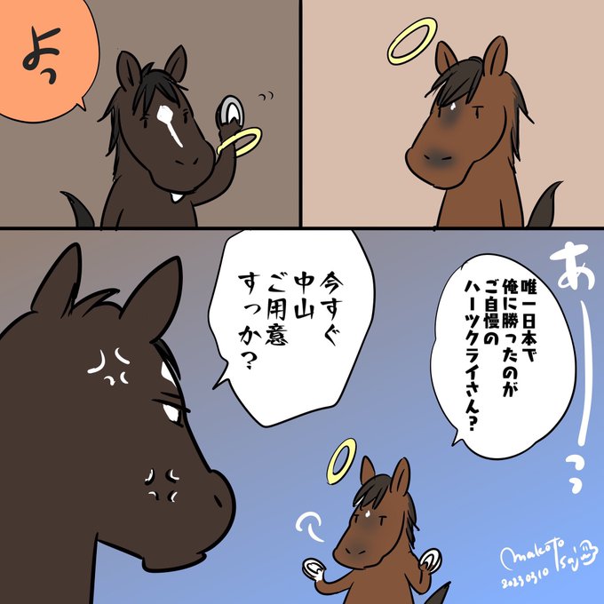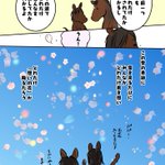 ディープとハーツクライの再会は今年3月。そこからふたりで切り盛りしている様子です。とにかく優しい世界にと奮闘中。 (あとその前のディープインパクト記念でアスクビクターモアが勝った時の) #にじのはしの小さいおはなし #ディープインパクト #ハーツクライ twitter.com/makoto_tsujii/…