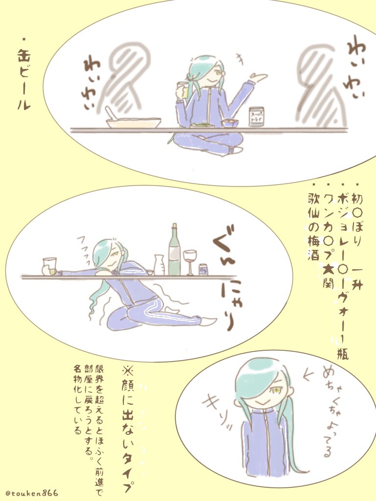 #にっかり青江で深夜に創作60分 テーマ「新酒」 先日、弊本丸のぁぉぇ君お酒事情についてぶつくさ呟いたんですけど、うちのぁぉぇ君は割と平気な顔してパカパカ飲みますし、チャキチャキ喋ります。 但し、一定量超えると匍匐前進で部屋に戻ろうとします。 今回、新酒もいつものも飲んでますね。