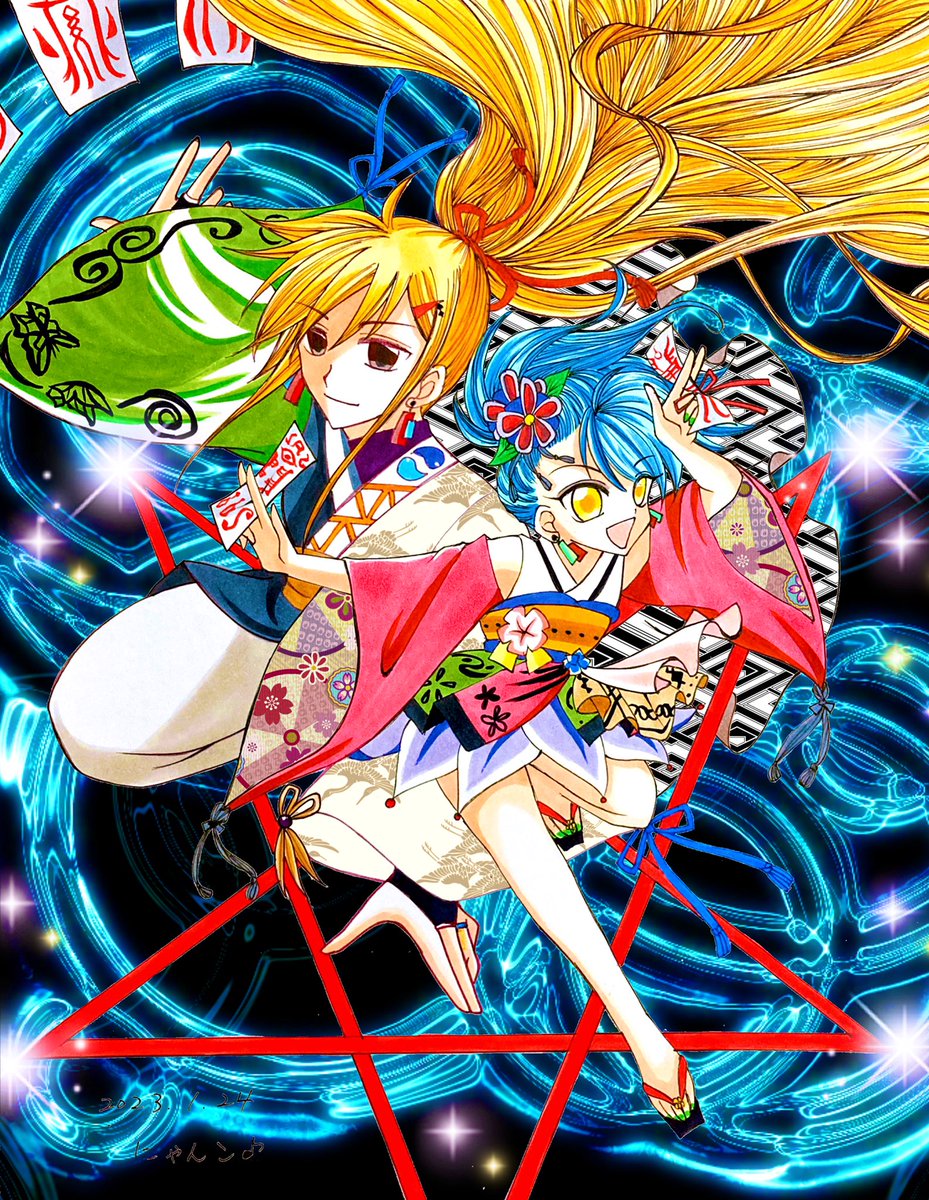 ☪アカハル/リク絵④☀️ 『陰陽師』 ☀️「急急如律令ー💕💕✨」 ☪「……😌💗✨」 張り切ってバトって頂きましょう🎶 ちょっと柄多めですがご愛嬌で🙏🍀 リク有難うございました💖⸜(*ˊᗜˋ*)⸝💖 #にゃんこのアカハルチャレンジ2023 #みんなで楽しむTwitter展覧会 #イラスト #二次創作