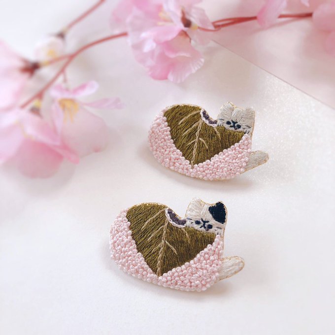 【桜餅を食べる猫の刺繍ブローチ】ハンドメイド・クリエイター作品のマーケットプレイス Creema creema.jp/item/13465697/… @Creema_jpより 塩味の効いた桜の葉っぱとふんわり甘い餡子との甘じょっぱい春のお味をお伝えできるよう、色選びや縫い方にこだわりました🍡 #にゃんだふるCreema #猫の日