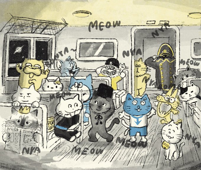 Ohayoございます つぎの停車星はうめ星 停車時間は99時間です。 車内はニャアニャア大賑わい。 #ネコの日 #イラスト #クリエイターさんの夜っぽい #猫の日2023 #みんなで楽しむTwitter展覧会 #にゃんこの日 #にゃんにゃんにゃんの日 #銀河鉄道999 #松本零士さんありがとう