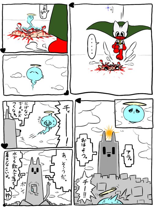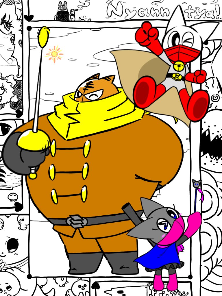 こんばんは! 今日は晴れてましたね!! 気持ちの良い一日でした! ルンルンです にゃん茶です! マスクニャン、ミャオンマスク、ノラオレ仮面の三猫組 #イラスト好きさんと繋がりたい #漫画が読めるハッシュタグ #コマ割りイラスト #にゃん茶 #罪ほろぼしの使者