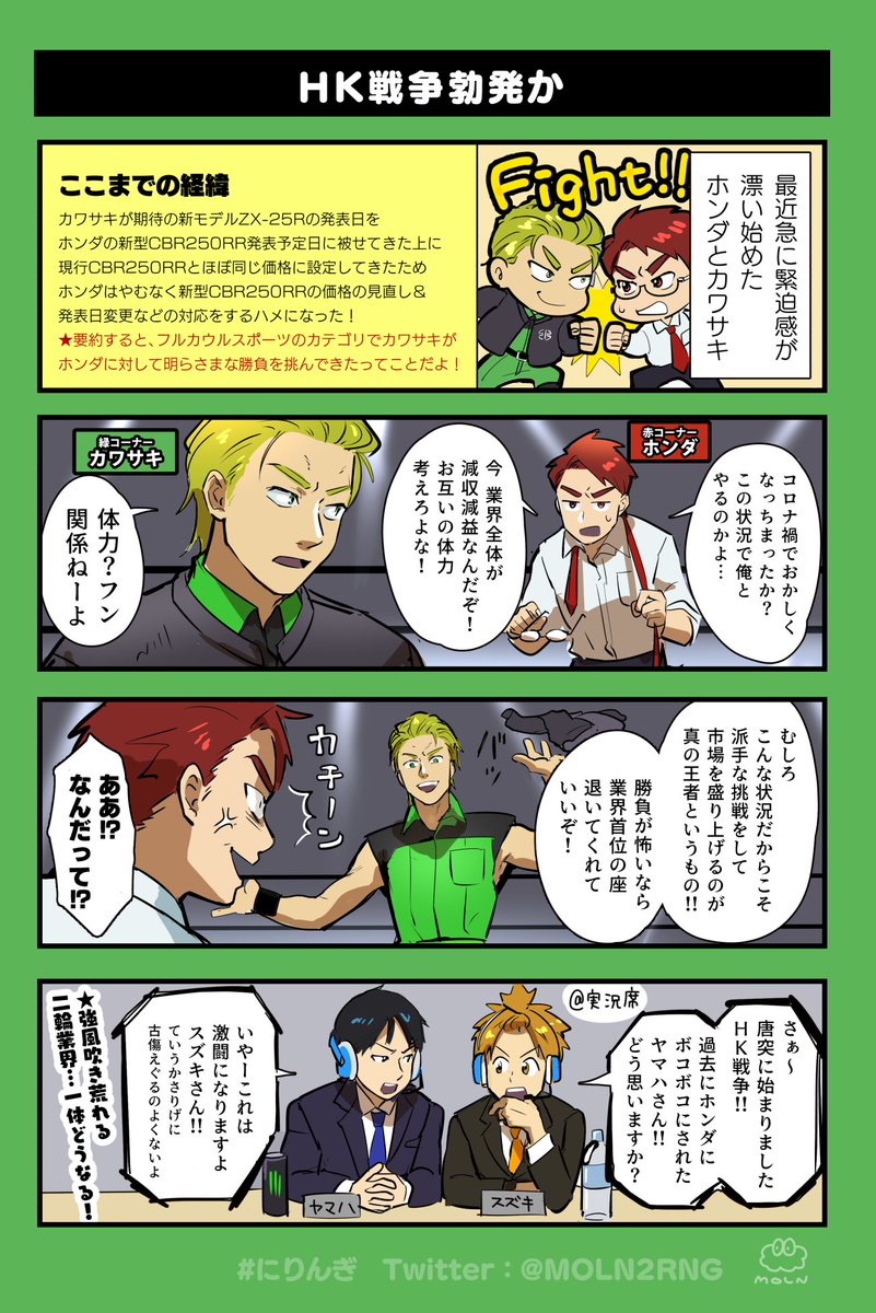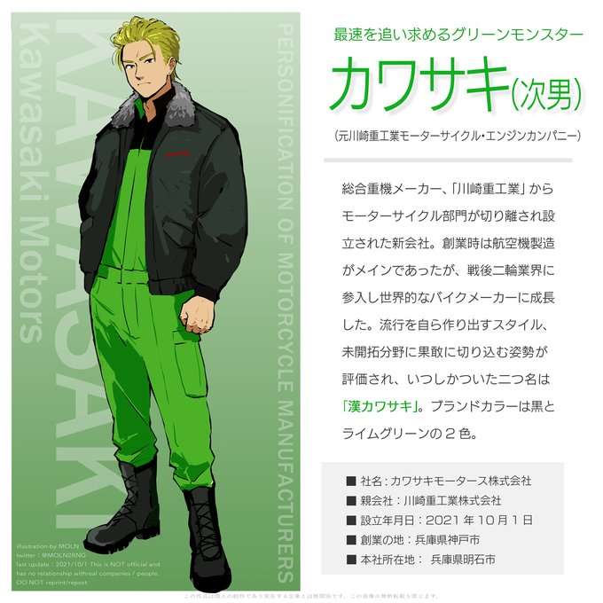 カワサキのモーターサイクル部門と車両部門が分社化したよ~ということでキャラシを作りました。カワサキ兄弟をよろしくおねがいします!今日がお誕生日です!生まれたてホヤホヤです! #バイクメーカー擬人化 #にりんぎ