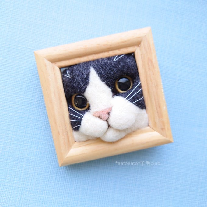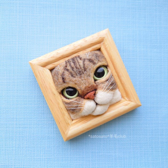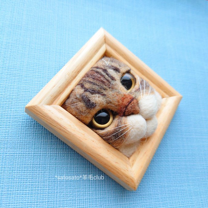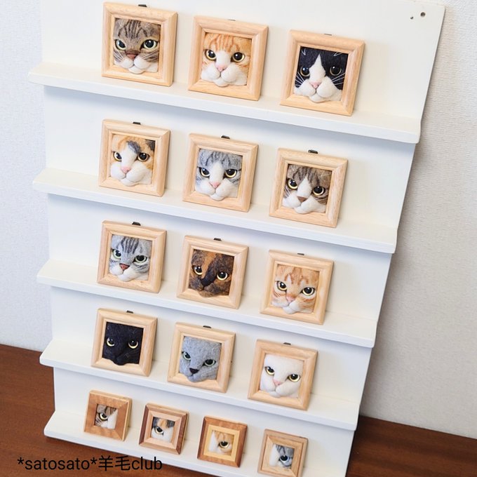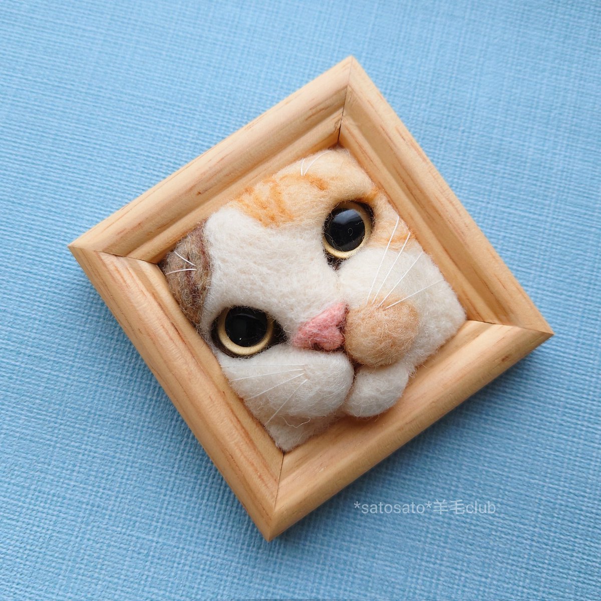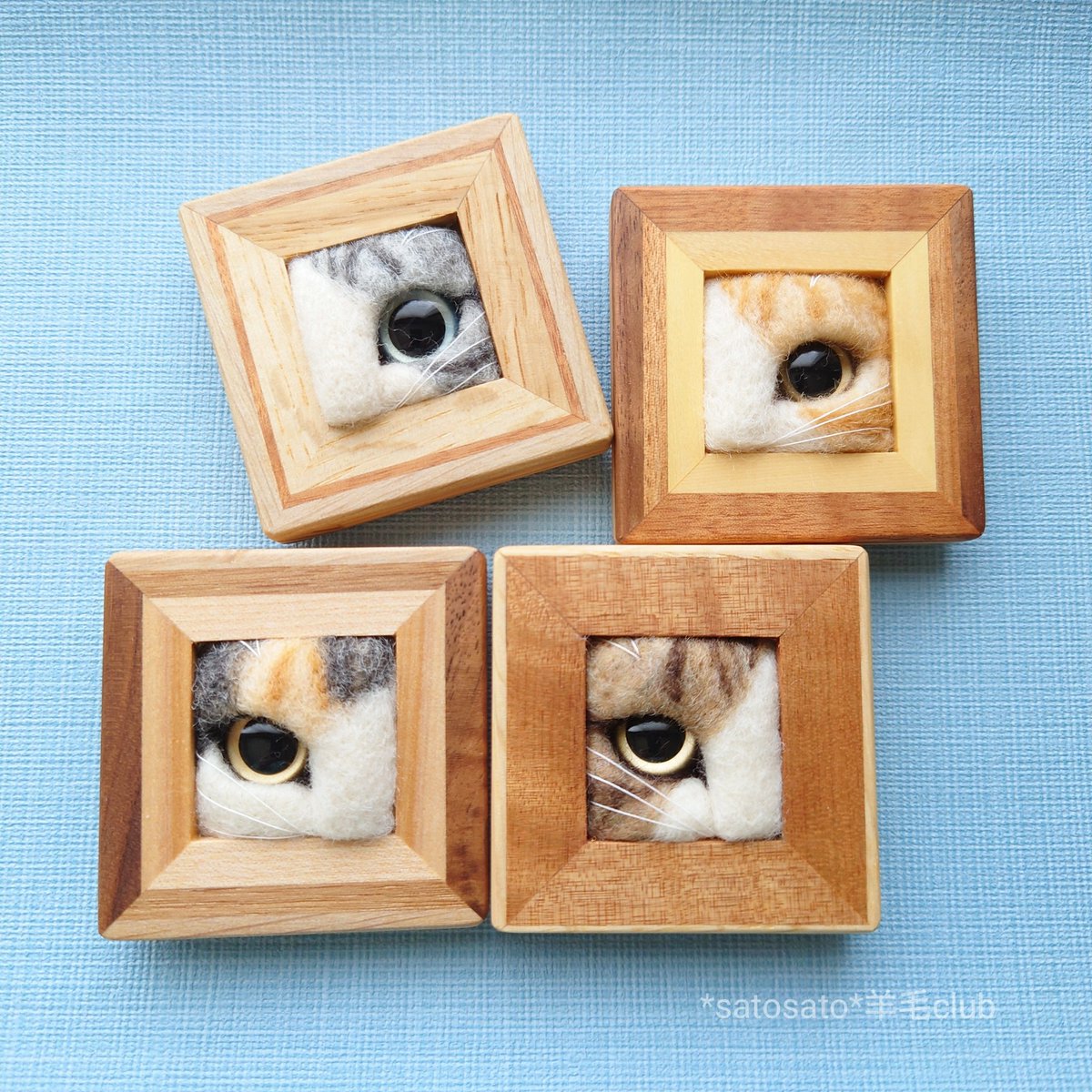 明日の #ねこ休み展 の追加納品の作品は、沢山作れないので厳選して一番ノーマルな白木の #猫フレーム とミニフレームだけになりました🐱 ミニは片目と口元と迷って今回は #片目の猫フレーム 4個。 目力キラーンです✨ #羊毛フェルト #猫フレーム #ねこ休み展夏2022(浅草橋) #猫好きさんと繋がりたい