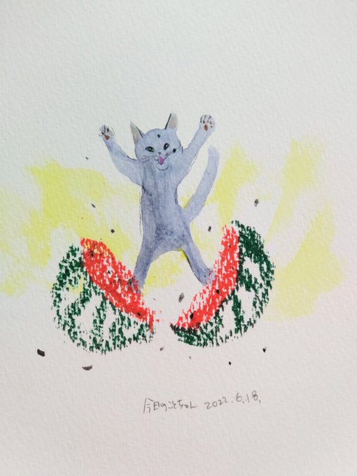 おはようございまスイカ〜🍉🍉✨✨ 6月18日 土曜日2022 #今日のことちゃん #ねこの絵 #ねこ #猫好きさんと繋がりたい #ねこ好きさんとつながりたい #猫 #猫がいる幸せ #ロシアンブルー