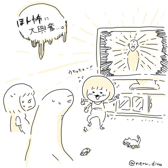 ほん怖の山内さんに大興奮の娘...。 3歳にとっては光り輝くジィジはヒーローでしかない。 #ねてるきょうりゅう #ほん怖 #山内さん #家族日記 #育児日記 #育児絵日記 #育児漫画 #育児 #子育て #ママ垢さんと繋がりたい #漫画が読めるハッシュタグ #イラスト