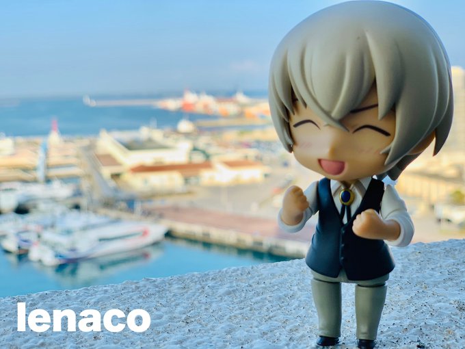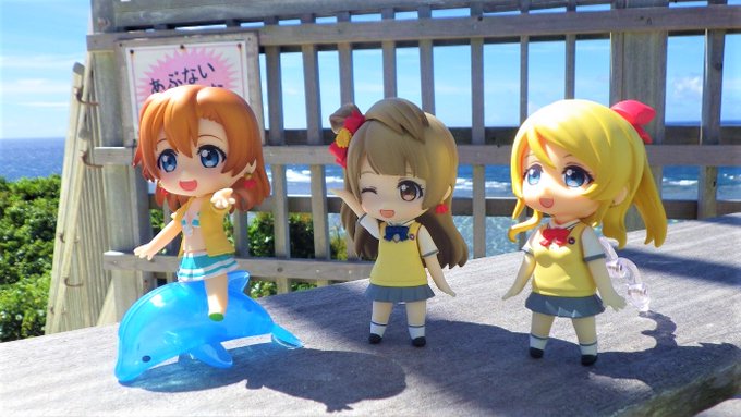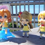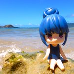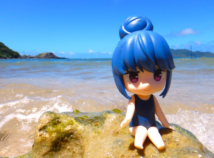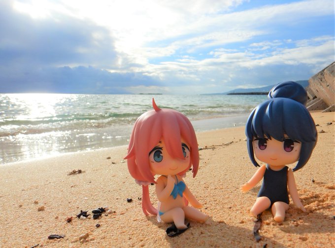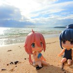 #深夜のねんどろ撮影60分一本勝負 #ねんどろいどちゅらさん部 5/3【ならぶ】【ふらいんぐ】 開放感あふれる宮古島の海を背景にしてねんどろ達もならび、イルカに乗れるのを待っているようです。
