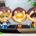 『ねんどろいどもあ なりきりずきん たこやき』を王様たちに被ってもらいました。 この可愛らしさと味わい深さ、とても癒やされます🥰 通常の被り物が厳しめのアーサーやオジマン様でも少し余裕があるので、ツンツン髪や頭の大きい子でもいけると思います。 #ねんどろいどカルデア