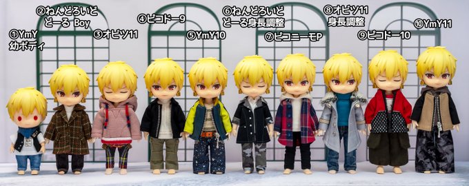 【ボディ11種の背比べ】 我が家にあるボディ11種を比較してみました。 1枚目はピコドー8を除く10種を背の順で並べての比較。 2枚目はYmY幼ボディを除く小さい系6種、3枚目は大きい系4種にそれぞれ同じ服・小物を着用させての比較です。 #ねんどろいどカルデア