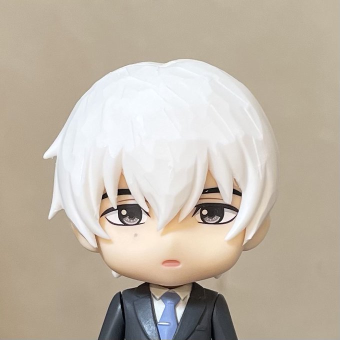 愛之介様の髪にハイライトとシャドウを足して少し彩度も落としておきました。お顔につや消しクリアも吹いてこれにて一応の完成です。 #SK8どーる部 #ねんどろカスタム神道愛之介 #ねんどろカスタム菊池忠 #ねんどろ作ったら出たと言いたい