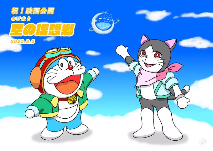 #ドラえもんファンアート #のび太と空の理想郷 映画観てきたーー!よかった! ソーニャがイケねこすぎる。 これはiPadでペンで描いたにゃφ(ΦωΦ) 雲描くのが途中から楽しかったけど、力尽きたのでこれで完成。
