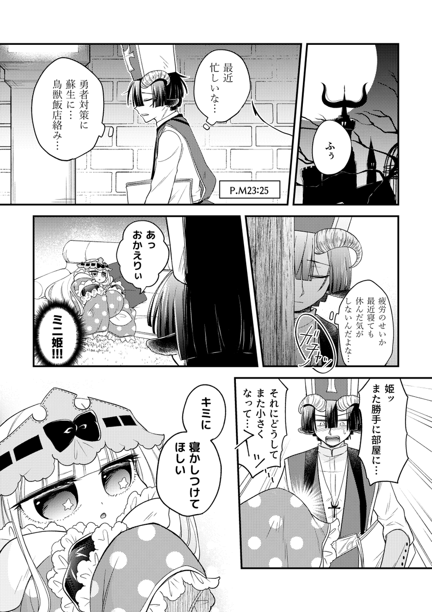 すーざん様主催のプレゼント交換企画 #はさみ魔物におねがい にて、かいな様(@kaina_utatane)のお題『ミニ化した姫の寝かしつけをするASさん』を描かせて頂きました✨ もはや赤ちゃん?なミニ姫とASさんの寝かしつけ大作戦、楽しんで頂けると嬉しいです!🌸 素敵企画をありがとうございます!😊 1/2