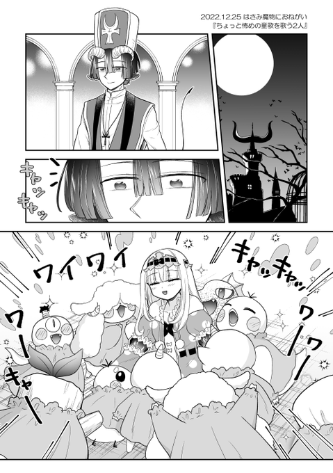 #はさみ魔物におねがい すーざんさんの素敵企画に参加させていただきました!!! お題はすーざんさん(#su_zan8023)から 『幼い姫(分身体・記憶なし)のお世話する本体姫とあくまし。』 最後のページはあるクリスマス映画ネタです。 幼い姫がなんなのかまでは描けなかったので最後に詰めました笑