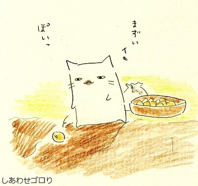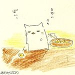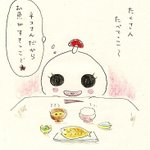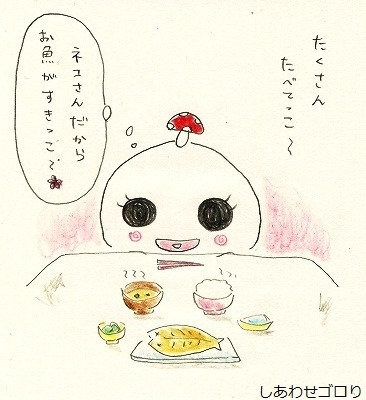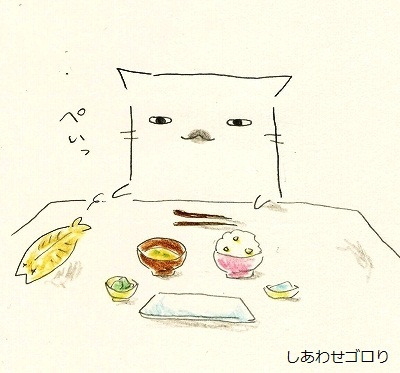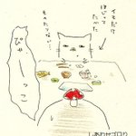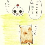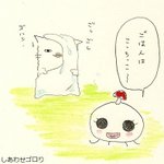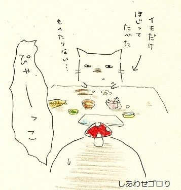 『はたけでゴロり』28こまめ。 お行儀よくごちそうさまをいたします。 まちるこさん、おさかなキレイにたべますね。 ゴロもおいしくたべられたかな?? #漫画が読めるハッシュタグ #イラスト #はたけ #ごはん #ごちそうさまでした #さつまいも