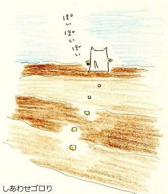 『はたけでゴロり』18こまめ。 おなかぺこぺこです。 きょうもおいもがおいしくたべられそうです。 後姿がネコに見えない件(。´・ω・) #漫画が読めるハッシュタグ #イラスト #おつかれさまでした #はたけ #さつまいも #タヌキ ?