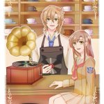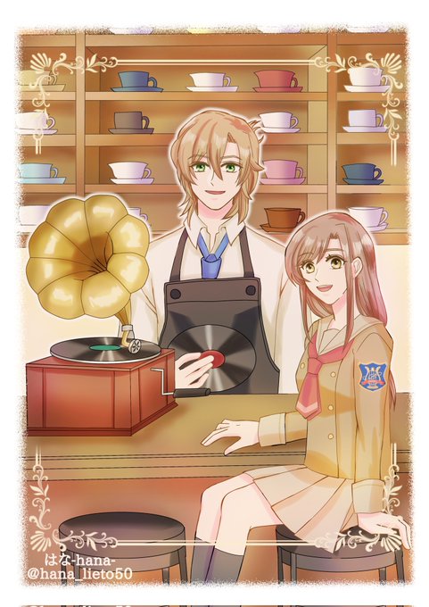7月31日は『🎵蓄音機の日🎵』 成宮くんと唯ちゃん。 蓄音機と喫茶店いいな〜というのと、喫茶店にエプロンの成宮くんを見たくて😊 レコードとかも詳しそうな気がする〜 🥳 #スタオケアート部 #はなリエートのスケッチブック