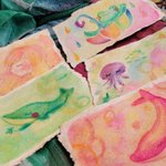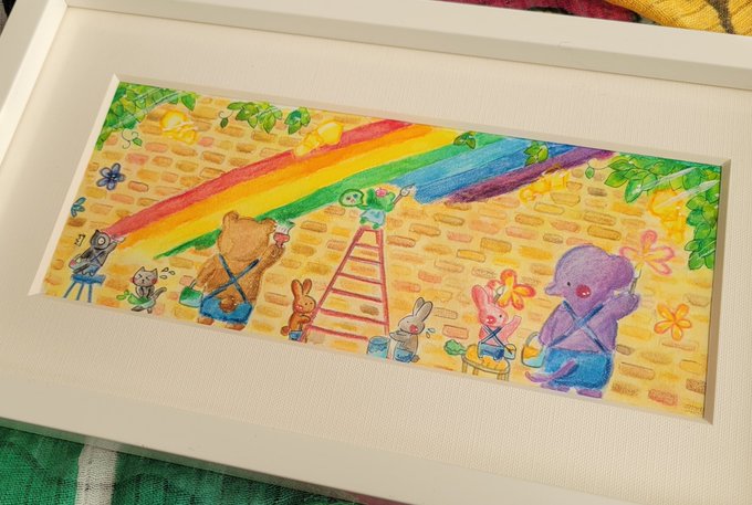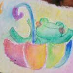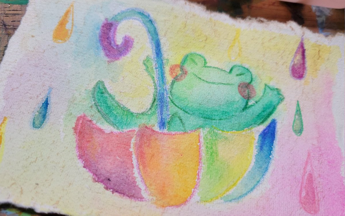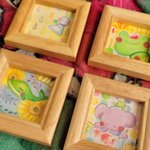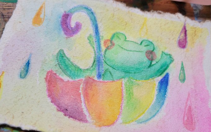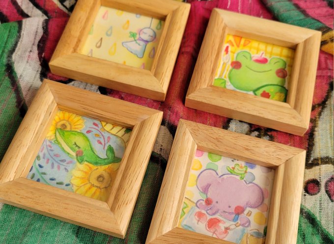 #ひだまりパレット ミニ原画は今回4点です☺️ 【カエル画伯】 【あめあめふれふれ】 【カエル画伯の頭の中】 【カエル画伯のお絵描き教室】 先日無事送り出せました! 大好きなカエル🐸さん沢山描けて楽しかったです🤣 #イラスト #絵描きさんと繋がりたい