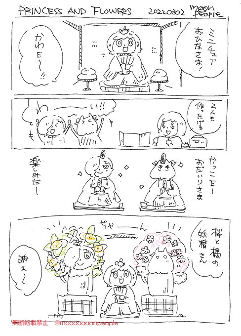 2022.03.02 PRINCESS AND FLOWERS これがホントの両手に花ってね🌸🍊 3月2日は語呂合わせで「ミニチュアの日」。今は色んなタイプのお雛様があるよね。 #4コマ漫画 #創作漫画 #コメディ #ひな人形 #漫画が読めるハッシュタグ twitter.com/mooooooonpeo…