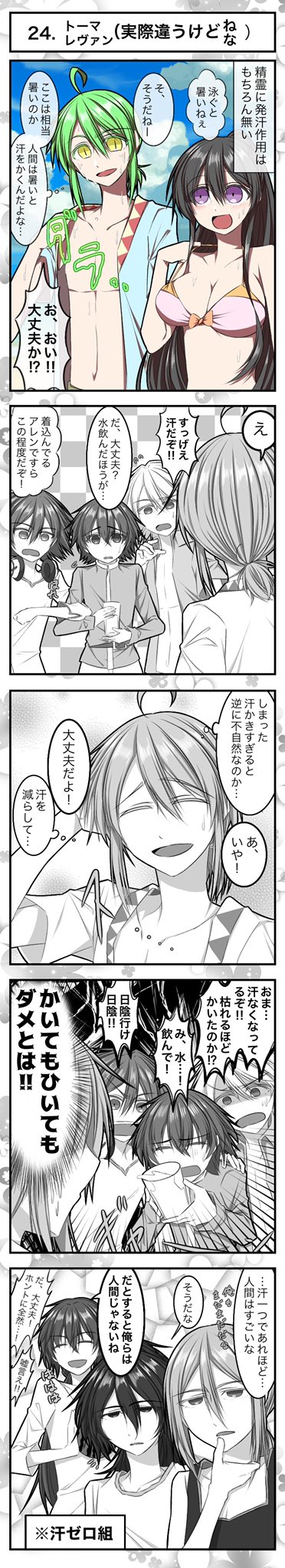 #ひまっくすレコード #絵描きさんと繋がりたい 海回最後ー!精霊に汗かくなんて概念はないからしょうがないね( ^ω^ )そしてトーマも本当は魔物(ゾンビのようなもの)なので一滴もかきません 逆に普通の人間なのに全く汗かかない&寒がりもしないゼノは体温感覚が死んでます😅寒さにも強いよ!