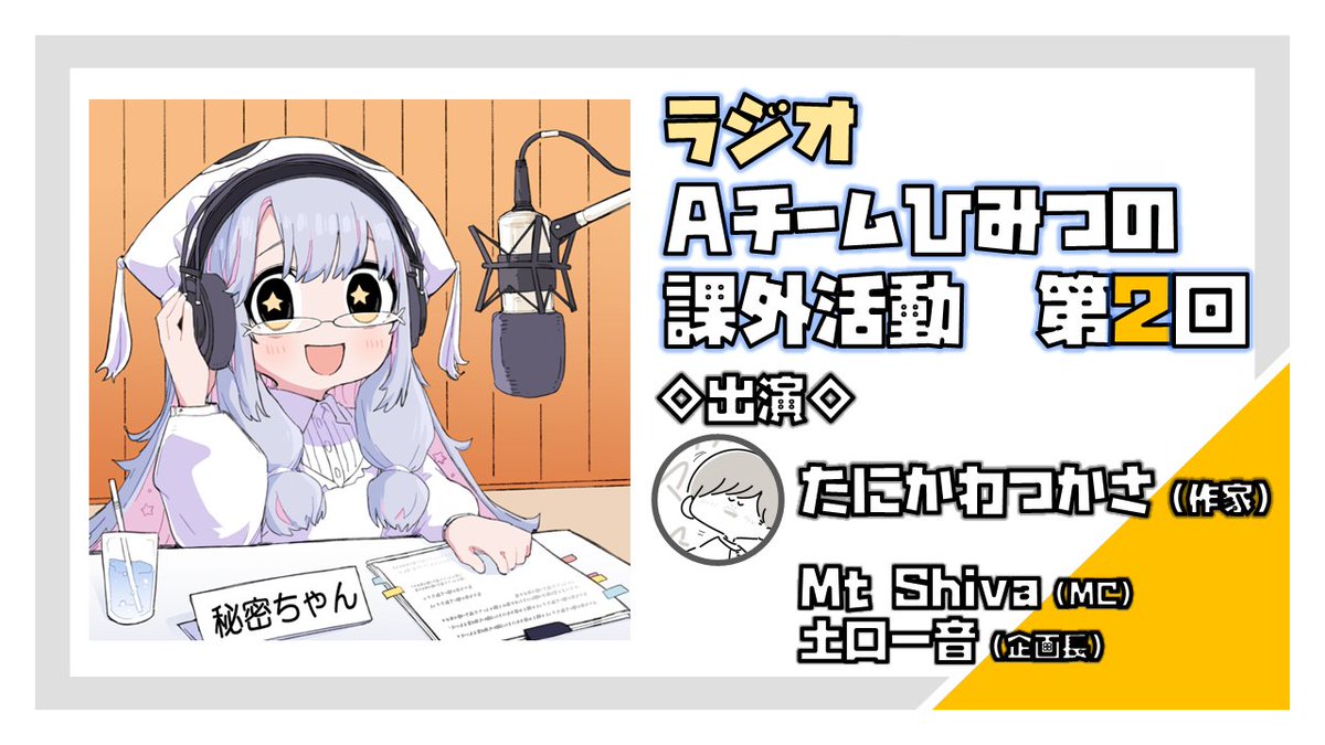 📢1時間後から📢 「Aチーム #ひみつの課外活動 第2回」を配信するの‼️ youtu.be/NI297B38dCs ゲストはたにかわつかさ(@tsukacharn)さん❗ 司会はMt Shivaさんと土口一音(@KAZtoguchi)さんなの☺️ みんなぜひ聞いてなの~🥰 #ひらめきマンガ #COMITIA142 #コミティア142
