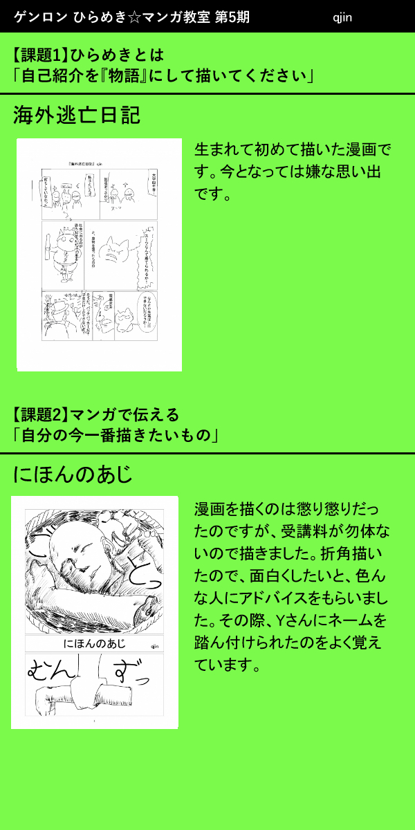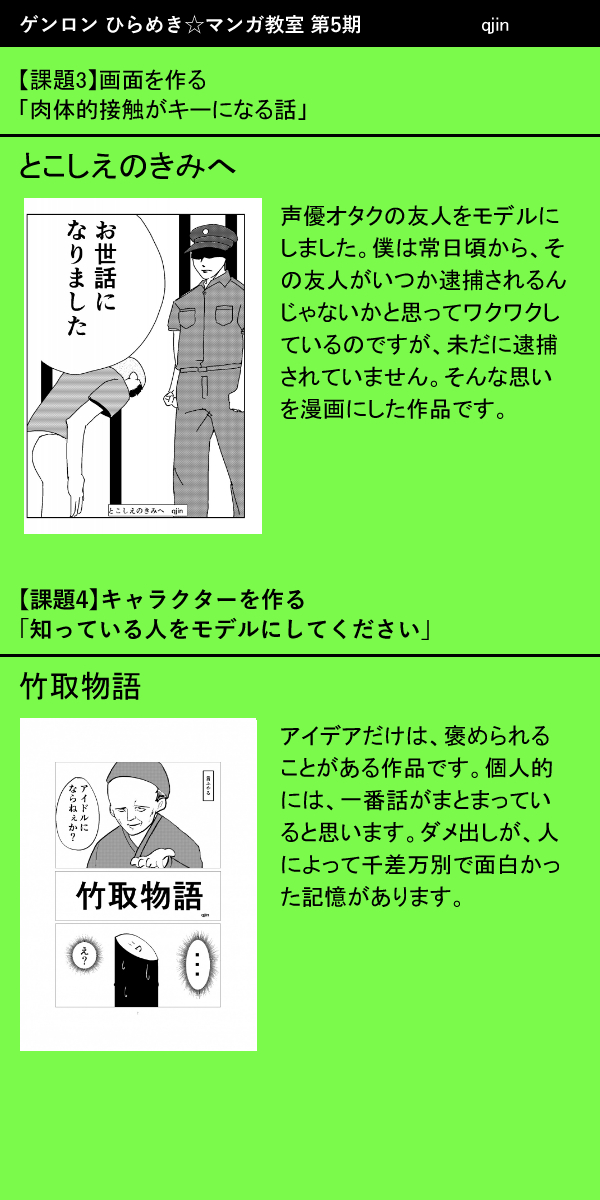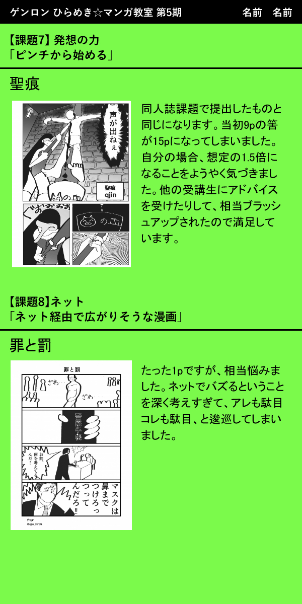 ひらめき☆マンガ教室 第5期での 提出作品の一覧と振り返りコメントです。 マンガはこちらから! school.genron.co.jp/works/manga/20… マンガ教室の最終講評会の無料中継はこちらから! youtube.com/watch?v=dCfHde… #ひらめきマンガ #漫画が読めるハッシュタグ (1/2)