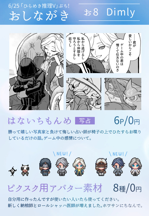 今回もホワサンにお部屋をとりました。展示とアバター配布してます。あとゆるくエアスケブ予定です。 会場マップのドットが本当にすごいのでぜひ遊びに来てください! pictsquare.net/z0tlunmwzge5lj… #ひらめきV
