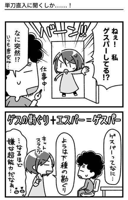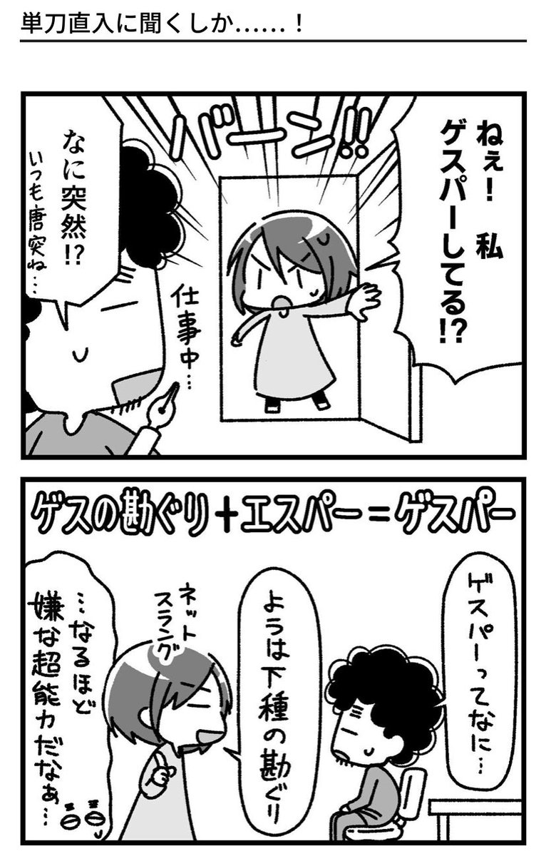 【1/2】#ふうふう子育て 18話 育児中、夫のなにげない発言を悪いほうに解釈したり 裏にある意図を勘ぐったり…もしや私はゲスパー(下衆の勘繰り+エスパー)して怒っているのでは?と思い、単刀直入に夫に直接聞いてみました! #子育て中の察してちゃん woman.mynavi.jp/kosodate/artic…