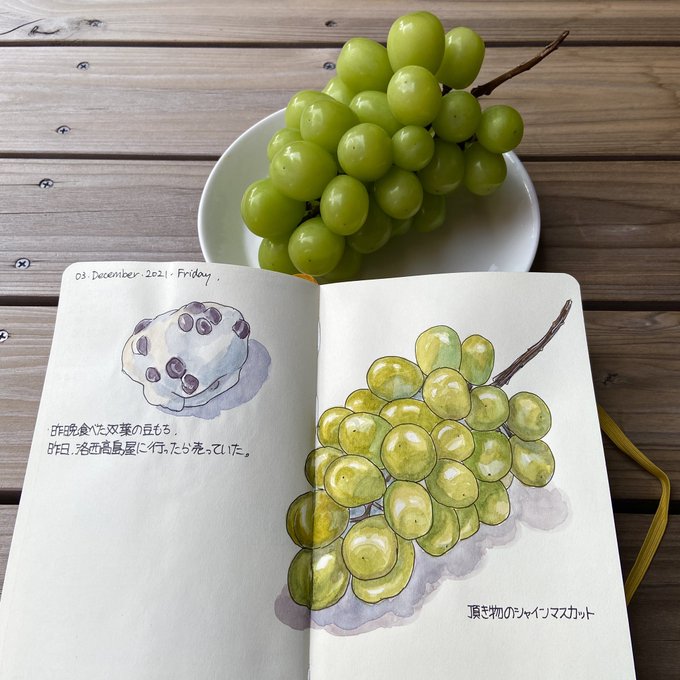 頂き物のシャインマスカットと高島屋で買った「ふたば」の豆餅。 #ふたば #豆餅 #豆大福 #シャインマスカット #絵 #イラスト #スケッチ #水彩画 #スケッチジャーナル #絵描きさんと繋がりたい #イラスト好きと繋がりたい