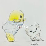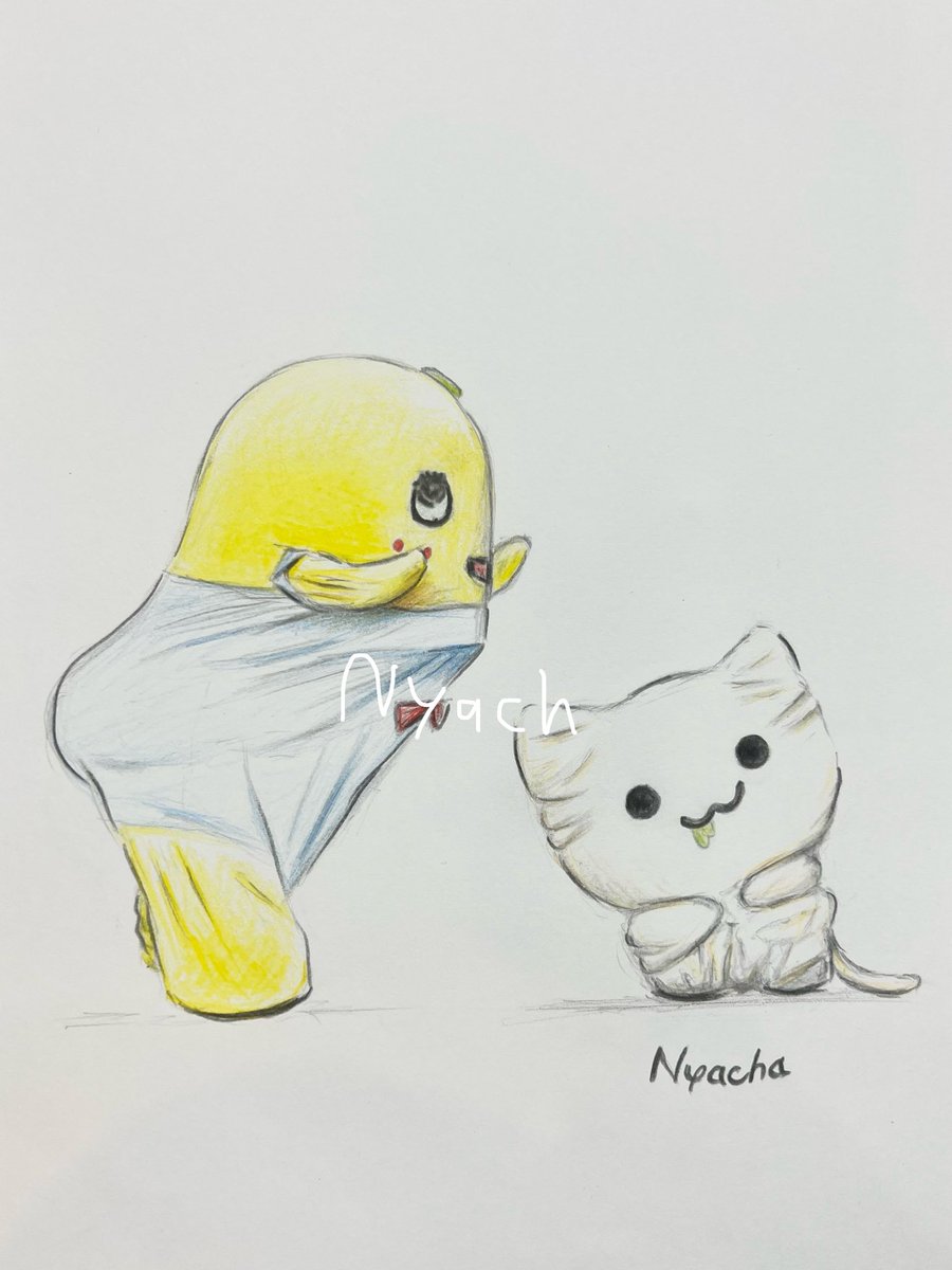 ぷりけつひよこふなっしーにゃんと、おすわりにゃーちゃ、描いてみたにゃ😽✏️🐾 #にゃーちゃ本気絵 ② #ふなっしー #ファンアート #イラスト #character #illustration #art