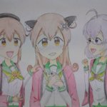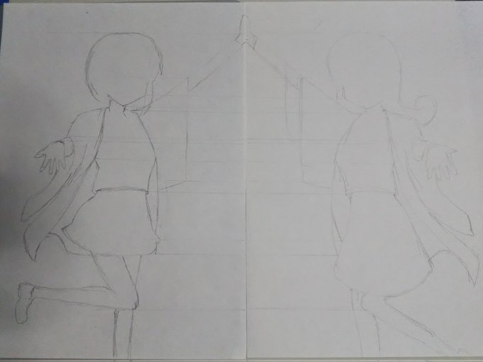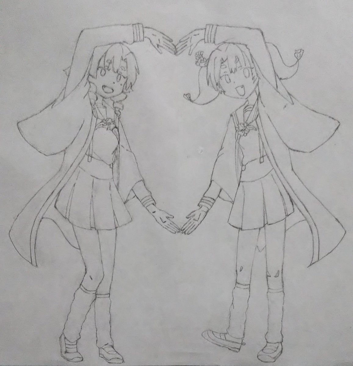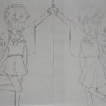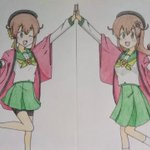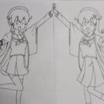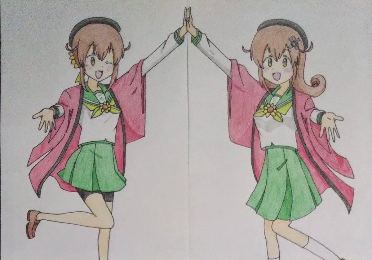 ぐっすり寝てしまってたので… #過去絵を投げて絵を描いた気になろうキャンペーン #ふなたん と #ふなとーたん の #ふなふなパネル です。🐈️ 左が描いたイラストで右が反転させたものです。 #ビッカメ娘 ( #ナイセン ) #ビッカメ娘を描き隊 #模写 #色鉛筆 #絵描きさんと繋がりたい