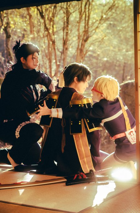 【コスプレ】 刀剣乱舞 いっぱいいっぱい愛されて、 ずっとずっと あたたかい時間に包まれますように。 #へし切長谷部国宝指定記念日 長谷部:ピロテケ 博多:みのむ 日本号:匠 📸:なむぅ