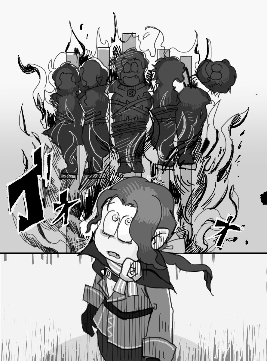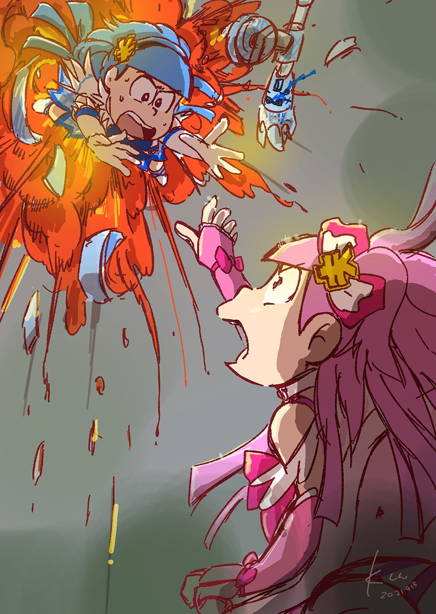 魔法少女 おそ松ちゃん5周年なので魔法少女パンツァーのストーリー描いてみました。カラ松に早く飛び乗って!!っていうトド松かっこよ。パンツァー魔法少女かと思わせといて王道胸熱メカものです! #へそウォストーリーの一場面を絵で描いてみた
