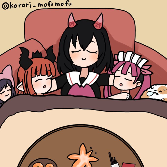 『うたた寝』 こたつでうたた寝する鬼ちゃんとりなぞうとのじゃ姫とデスメタルさやかとモルモルとりつ姉キャッツのイラストです👹😋👸🐈✨ #大晦日だよirodori祭り #へんたつ #へんたつファンアート #irodori #イラスト